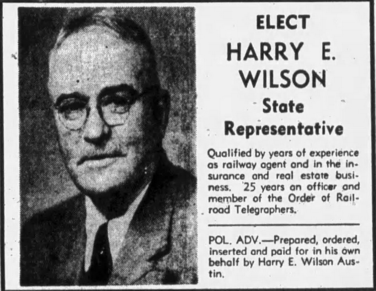 Print advertisement for Harry E. Wilson's 1950 HD 05 general election campaign