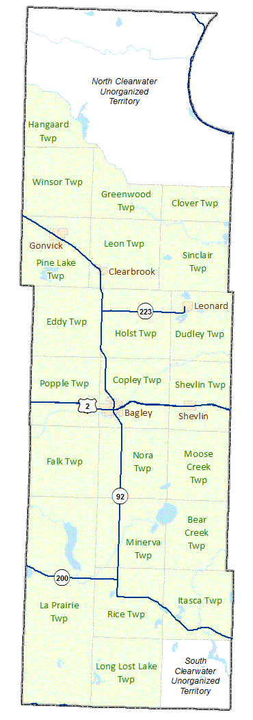 Clearwater County is located in Northern Minnesota and was established on December 20, 1902 by the State Legislature. The area was previously part of Beltrami County. Clearwater County is named after the county's Clearwater Lake and Clearwater River. Bagley is the county seat. Source: Minnesota Geographic Names, by Warren Upham (Minnesota Historical Society, 1969).