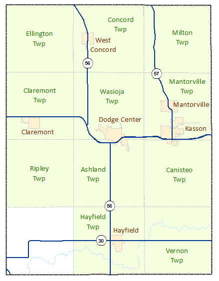 Dodge County is located in Southeastern Minnesota and was established on February 20, 1855 by the Territorial Legislature. Dodge County is named for Democratic Wisconsin Territorial Governor (1836-1841, 1845-1848), U.S. House Delegate (1841-1845), and U.S. Senator (1848-1857) Henry Dodge. Mantorville is the county seat. Source: Minnesota Geographic Names, by Warren Upham (Minnesota Historical Society, 1969).