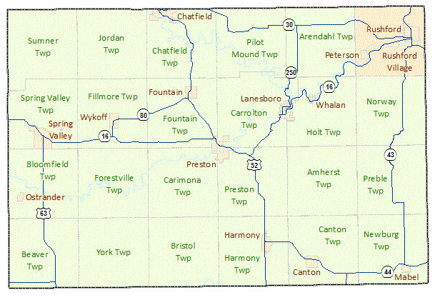 Fillmore County is located in Southeastern Minnesota along the Iowa border and was established on March 5, 1853 by the Territorial Legislature. Fillmore County is named after New York U.S. Representative (CD 32, 1833-1835, 1837-1843), Comptroller (1848-1849), U.S. Vice President (1849-1850), and President (1850-1853) Millard Fillmore. Spring Valley is the county seat. Source: Fillmore County website.