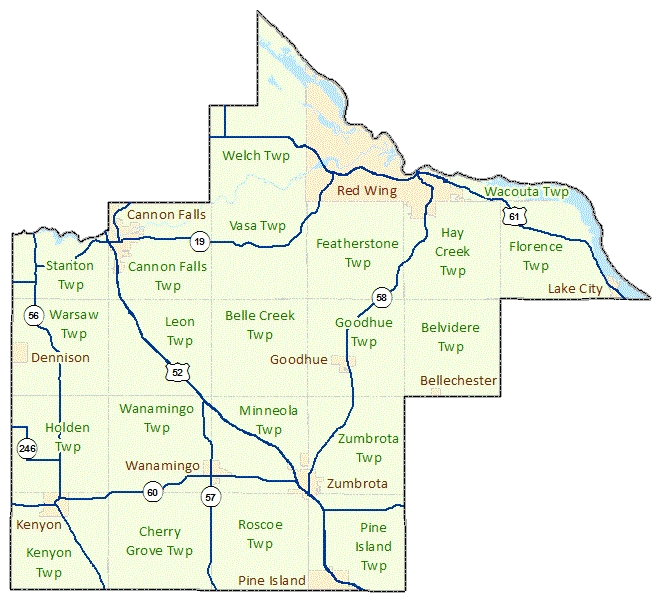 Goodhue County is located in Southeastern Minnesota along the Wisconsin border and was established on March 5, 1853 by the Territorial Legislature. Goodhue County was named after James Goodhue, founder of the Minnesota Pioneer newspaper and the first printer-editor in the state. Red Wing is the county seat. Source: Minnesota Geographic Names, by Warren Upham (Minnesota Historical Society, 1969).