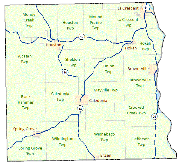 Houston County is located in the Southeastern corner of Minnesota along the Iowa and Wisconsin borders and was established on February 23, 1854 by the Territorial Legislature. Houston County is name after Tennessee U.S. Representative (CD 07, 1823-1827), Tennessee Governor (1827-1829), Texas President (1836-1838, 1841-1844), Texas U.S. Senator (1846-1859), and Texas Governor (1859-1861) Sam Houston. Caledonia is the county seat. Source: Minnesota Geographic Names, by Warren Upham (Minnesota Historical Society, 1969).