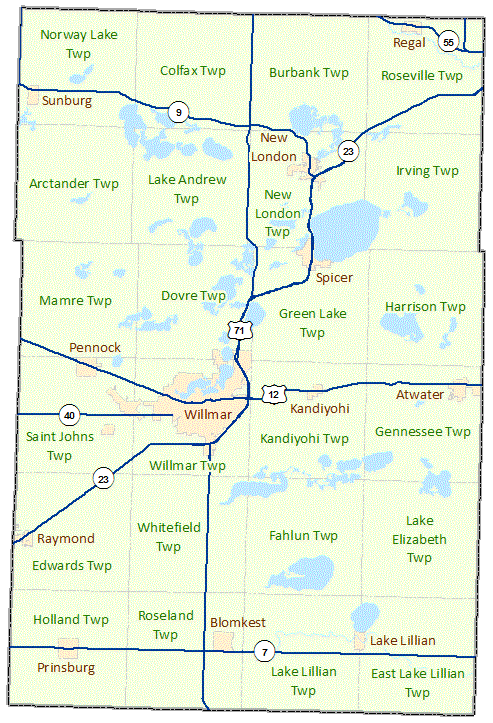 Kandiyohi County is located in Central Minnesota and was established on March 20, 1858 by the Territorial Legislature. Kanabec County was named from the Dakota word meaning "where the buffalo fish come" as fish swim upstream to spawn in nearby rivers. Kandiyohi merged with Monongalia County in 1870. Willmar is the county seat. Sources: Kahdiyohi County website. Minnesota Geographic Names, by Warren Upham (Minnesota Historical Society, 1969).