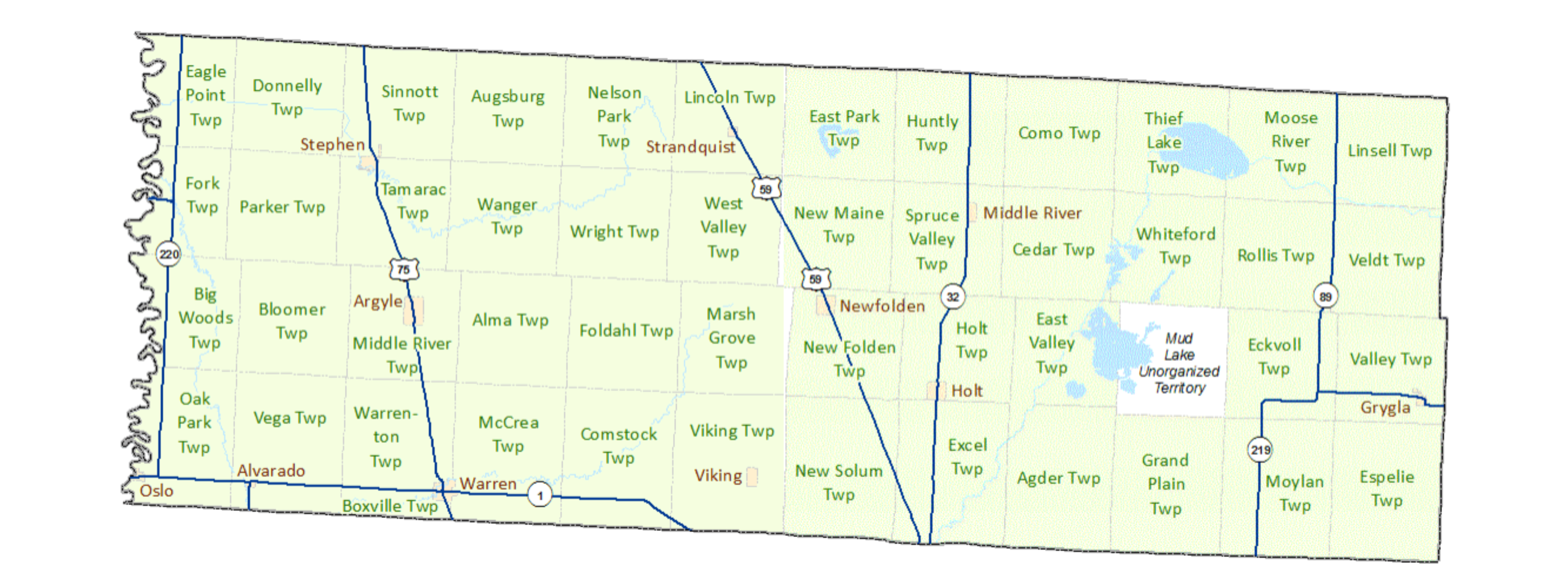 Marshall County is located in Northwest Minnesota along the North Dakota border and was established on February 25, 1879 by the State Legislature. Marshall County was named for Republican Governor (1866-1870) and Railroad Commissioner (1876-1882) William Marshall. Warren is the county seat. Source: Marshall County website. Minnesota Geographic Names, by Warren Upham (Minnesota Historical Society, 1969).