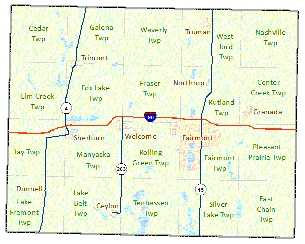 Martin County is located in South Central Minnesota along the Iowa border and was established on May 23, 1857 by the Territorial Legislature. Martin County is named for either an early settler from Connecticut named Henry Martin or Democratic Wisconsin U.S. Delegate Morgan Lewis Martin (1845-1847) who introduced the act to organize the Territory of Minnesota. Source: Martin County website.