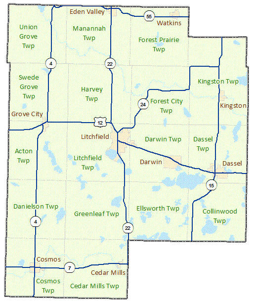 Meeker County is located in Central Minnesota and was established on February 23, 1856 by the Territorial Legislature. Meeker County is named after Minnesota Territorial Supreme Court Associate Justice (1849-1853) Bradley B. (B.B.) Meeker. Litchfield is the county seat. Sources: Meeker County website. Minnesota Geographic Names, by Warren Upham (Minnesota Historical Society, 1969).