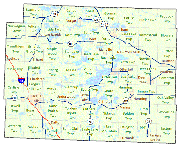 Otter Tail County is located in West Central Minnesota and was established on March 18, 1858 by the Territorial Legislature. Otter Tail County is named after Otter Tail Lake and Otter Tail River, the names for which came from the Ojibwe words for the sand bar shaped like the tail of an otter where the river enters the lake. Fergus Falls is the county seat. Sources: Otter Tail County website. Minnesota Geographic Names, by Warren Upham (Minnesota Historical Society, 1969).