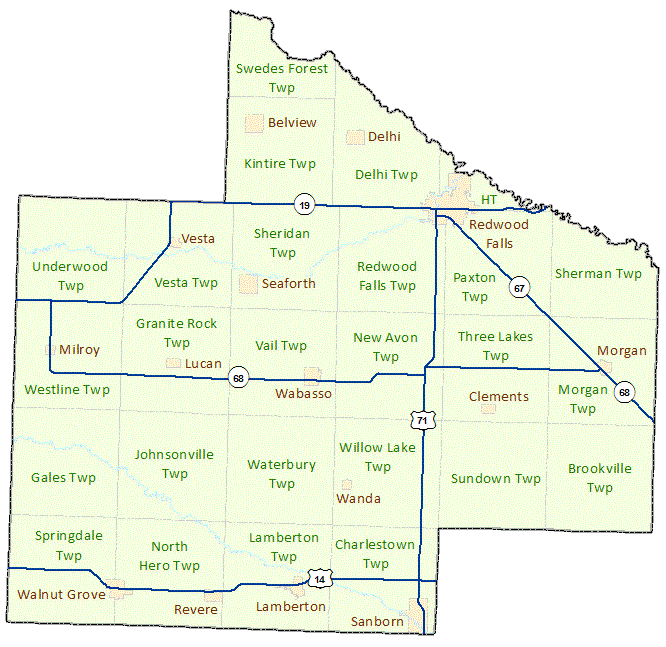 Redwood County is located in Southwestern Minnesota and was established on February 6, 1862 by the State Legislature. Redwood County is named for the county's cedar and willow trees. Redwood Falls is the county seat. Source: Minnesota Geographic Names, by Warren Upham (Minnesota Historical Society, 1969).