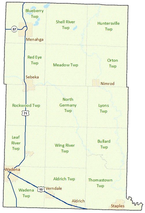 Wadena County is located in North Central Minnesota and was established on June 11, 1858 by the State Legislature. Wadena County is named after a trading post from an Ojibwe word meaning "a little round hill." Wadena is the county seat. Source: Minnesota Geographic Names, by Warren Upham (Minnesota Historical Society, 1969).